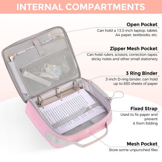 3-Inch 650-Sheet Zipper Binder with Adjustable Shoulder Strap & Handle, 3-Ring Zip Up Binder for School & Office, Multi-Pocket Binder with Dual Zipper Closure