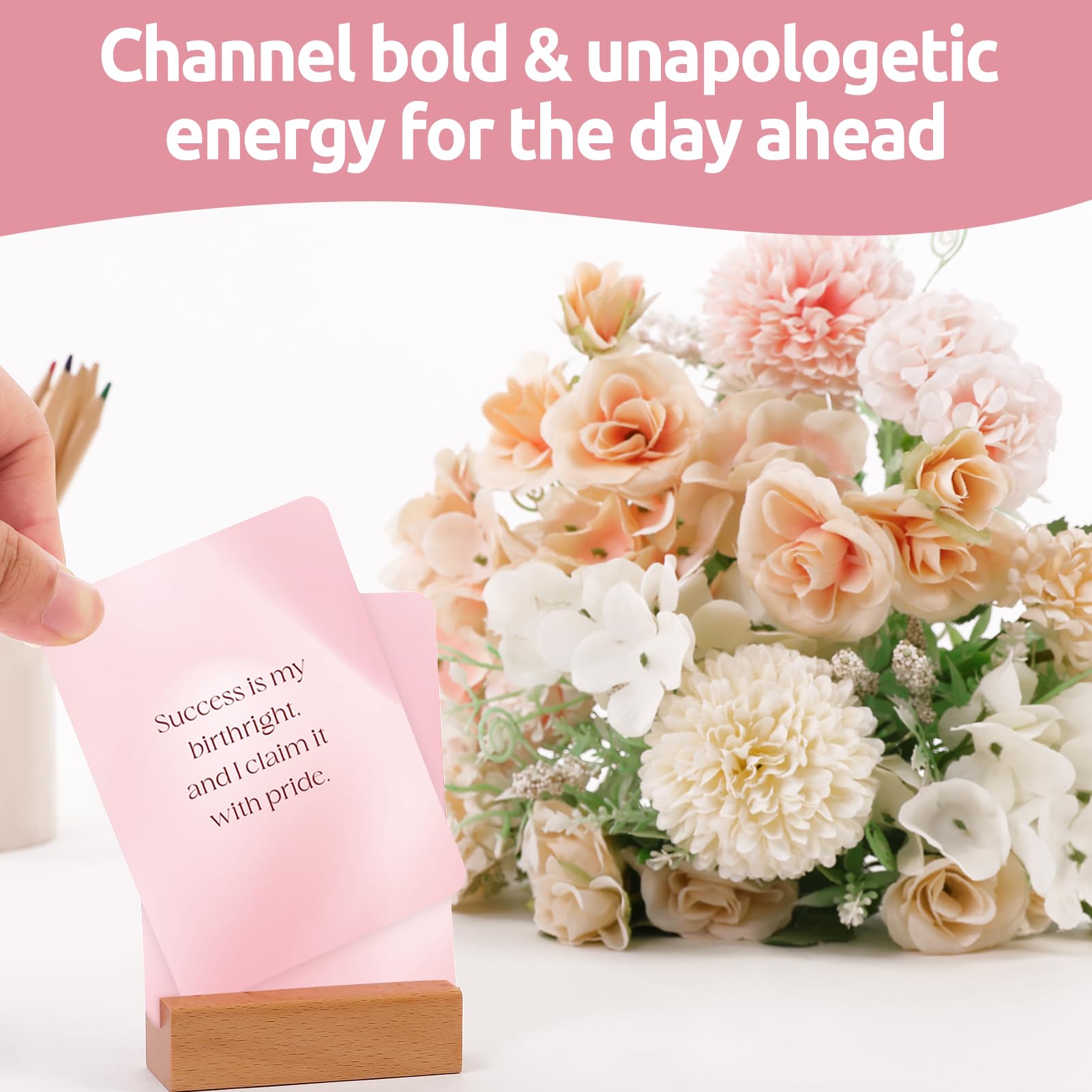 Affirmation Cards for Women with Display Stand, 53 Fierce Bold Messages with Floral Back Design – Pink Daily Inspiration & Motivational Cards for Women– Self Love Gift for Friends, Confidence & Mindfulness