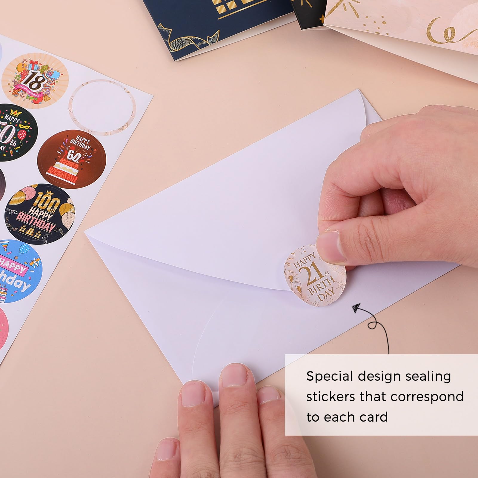 Birthday Cards with Envelopes, Assorted 24 Birthday Greeting Cards 4 x 6 inches, Happy Birthday Cards with Envelopes & Matching Stickers, for Particular Age