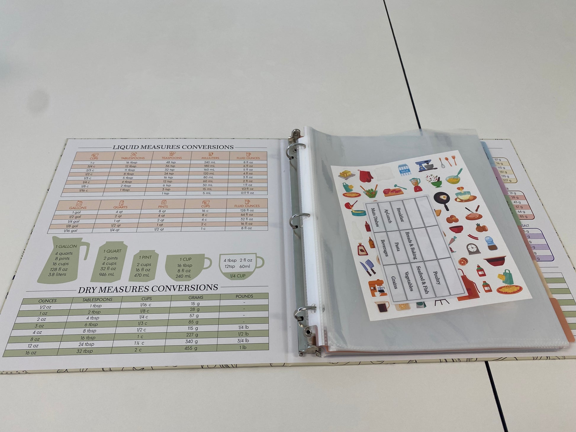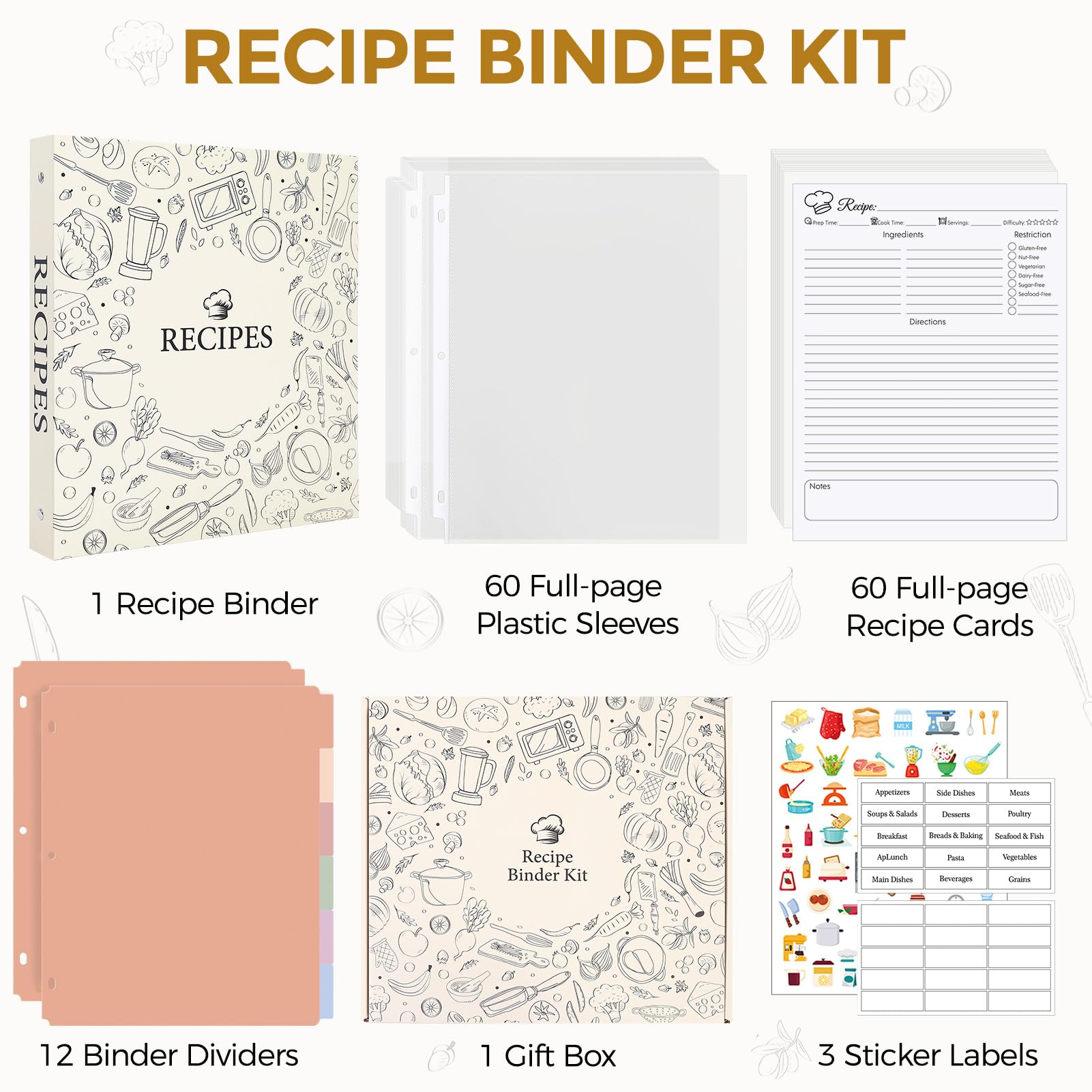 - Recipe Binder Kit – This all-in-one recipe binder includes a 3-ring binder, 60 full-page sheet protectors, 58 colorful recipe pages, 2 contents pages, 12 tabbed dividers, and 24 tab labels for easy and organized recipe collection.