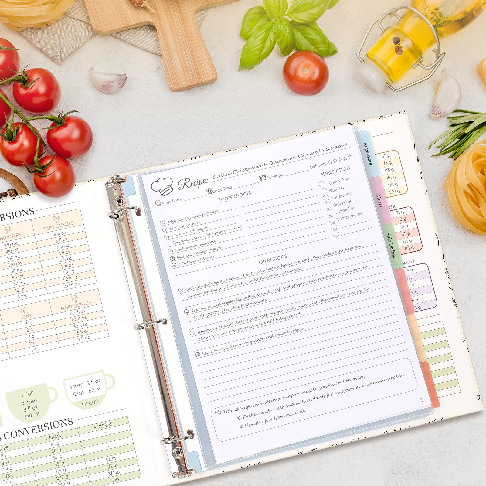 - Organized and Easy to Use – Featuring handy measurement conversion charts and ingredient substitution lists on the inside covers, this recipe organizer helps you keep your kitchen organized. The tabbed dividers make it simple to find and categorize recipes with ease.