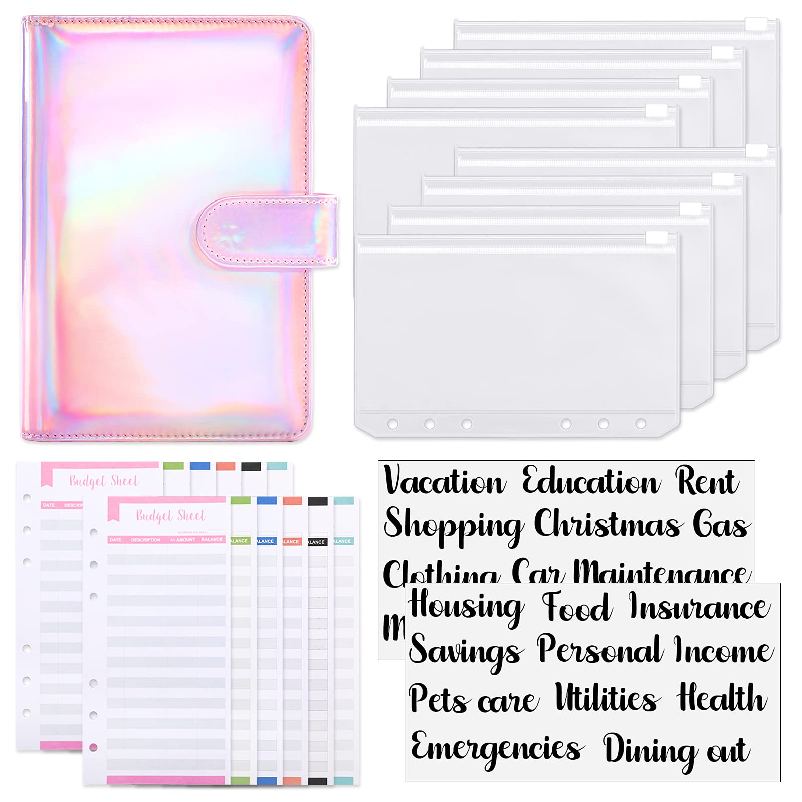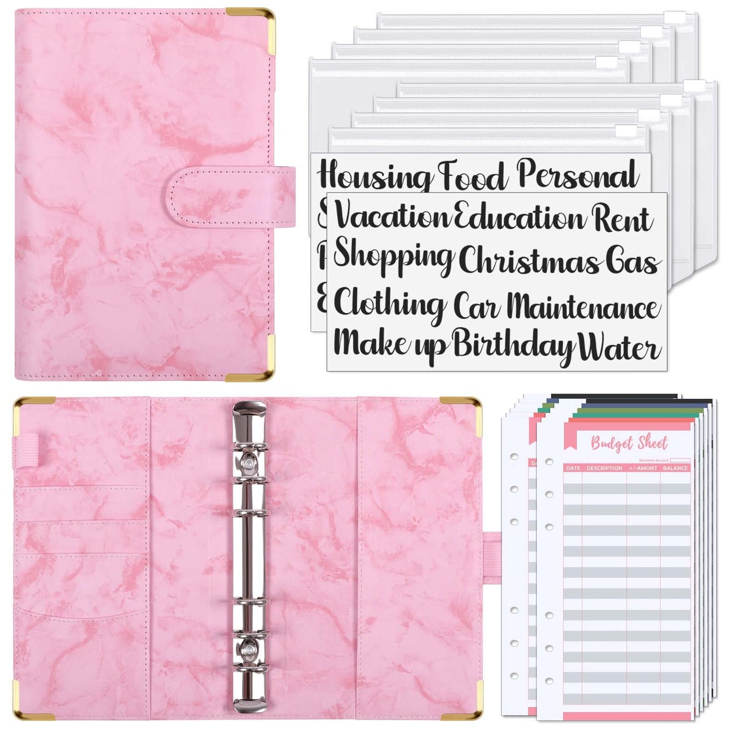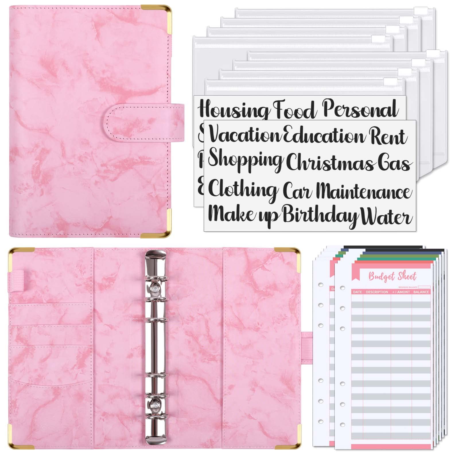 - Cash Envelopes System: 1pcs PU leather money saving binder, 8pcs A6 6-holes binder pockets,12pcs expense budget sheets,2 sheets of category sticker labels,Budget binder with cash envelopes perfect for you to save money.
