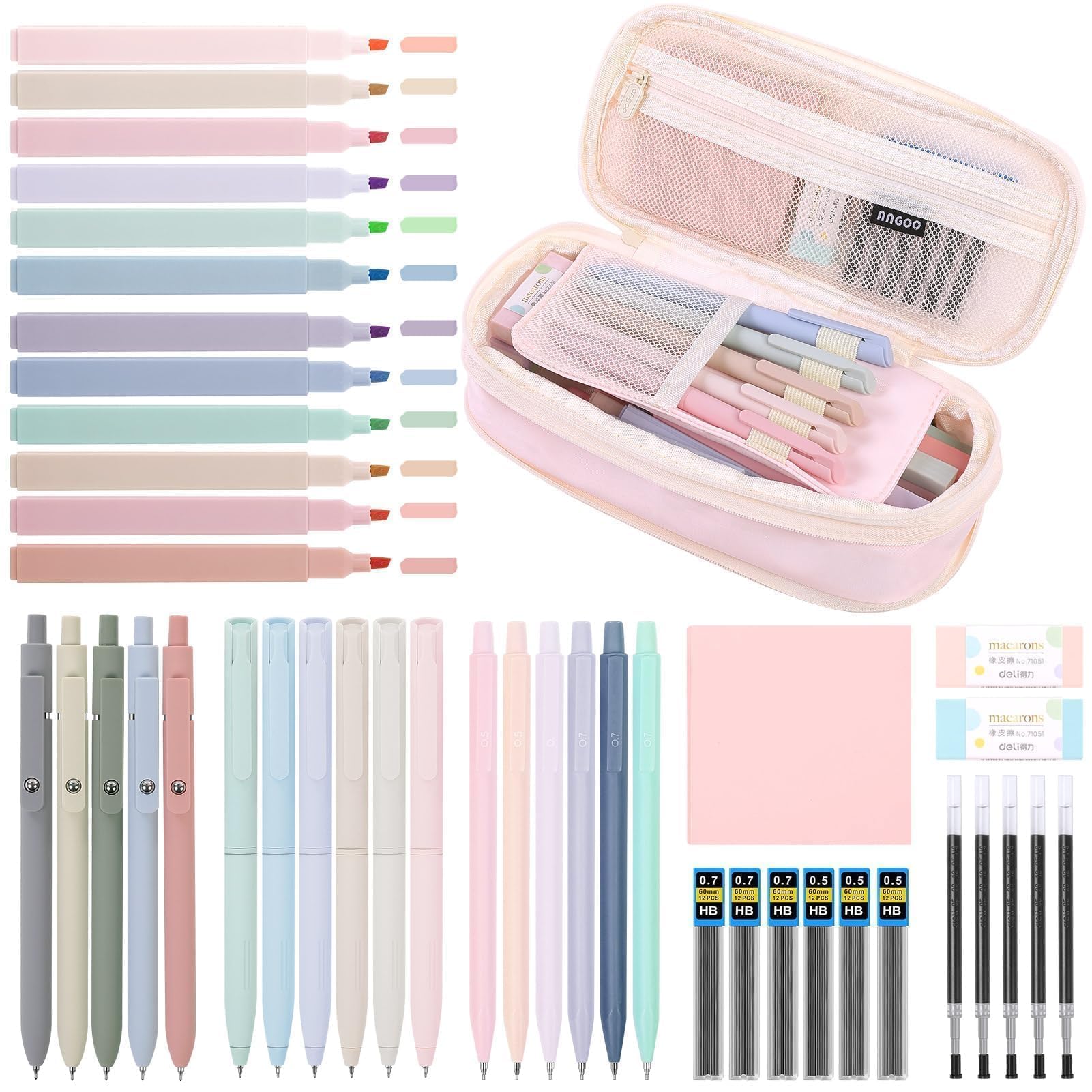 - Stationary Set:1 pencil case, 12 highlighters, 5 black pens, 6 colored pens, 6 mechanical pencils, 5 black pen refills, 6 boxes pencil lead, 2 erasers, 1 sticky note pad, and a set containing various stationery items to meet all your writing and marking needs. (Total 44 Pieces)