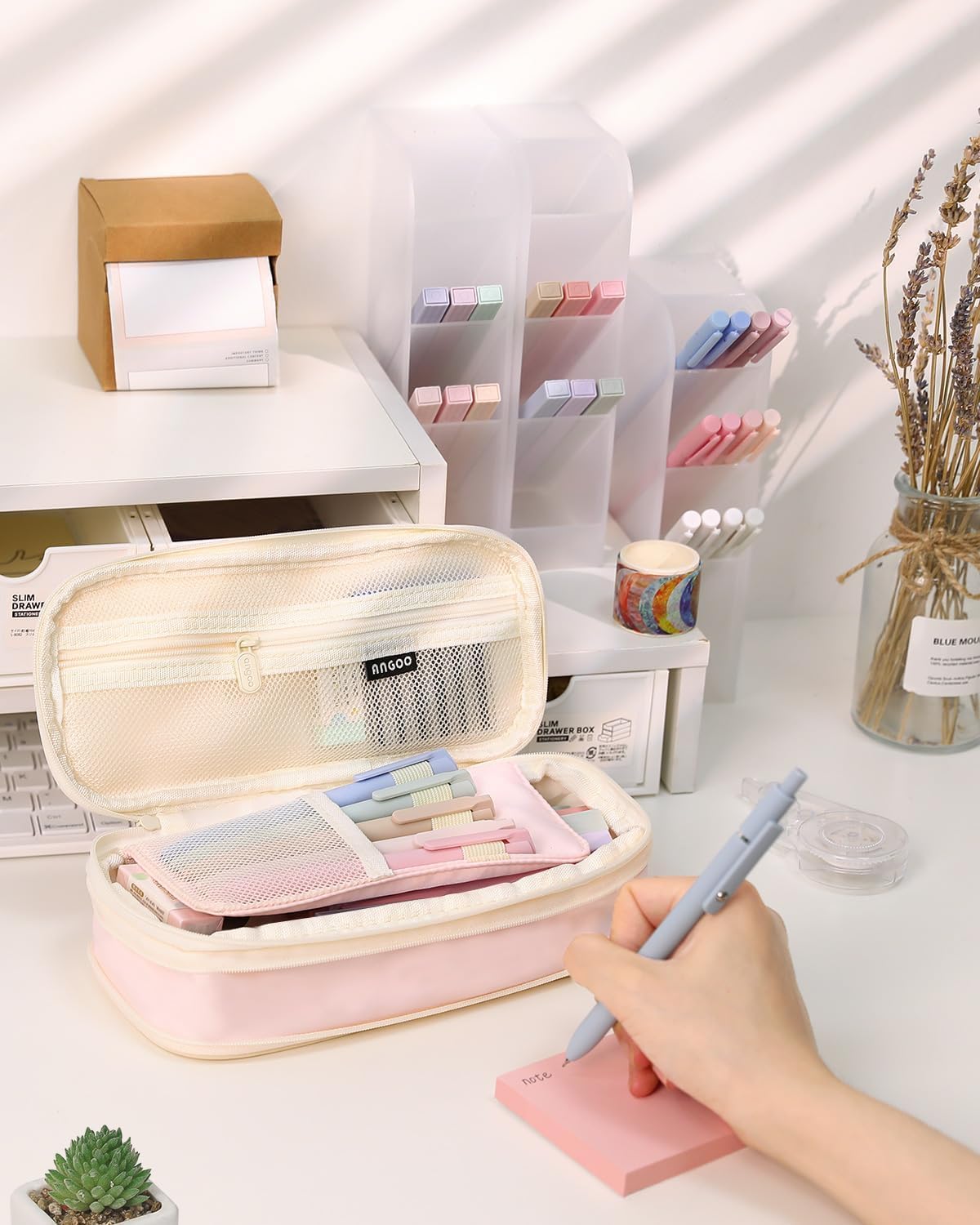 - Large capacity: Pencil case size 8.66 x 4.13 x 2.56 inches with large capacity storage, can store up to up to 50 pens or 90 pencils, and can store small stationery in the mesh bag.