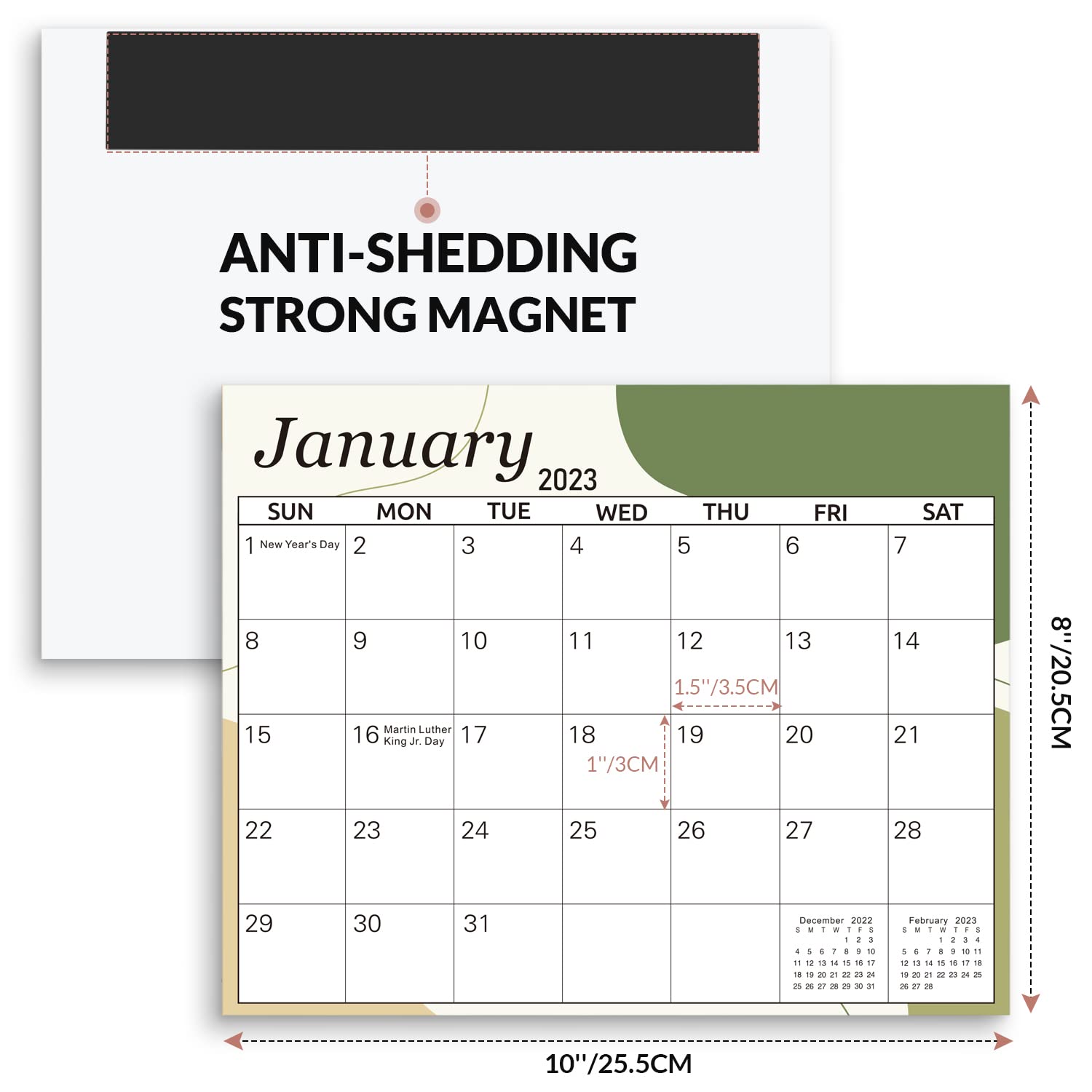 - Refrigerator Calendar Covers 17 Months:Monthly calendar from August 2022 to December 2023. The previous and next monthly reference in each monthly page can help you plan your time quickly.